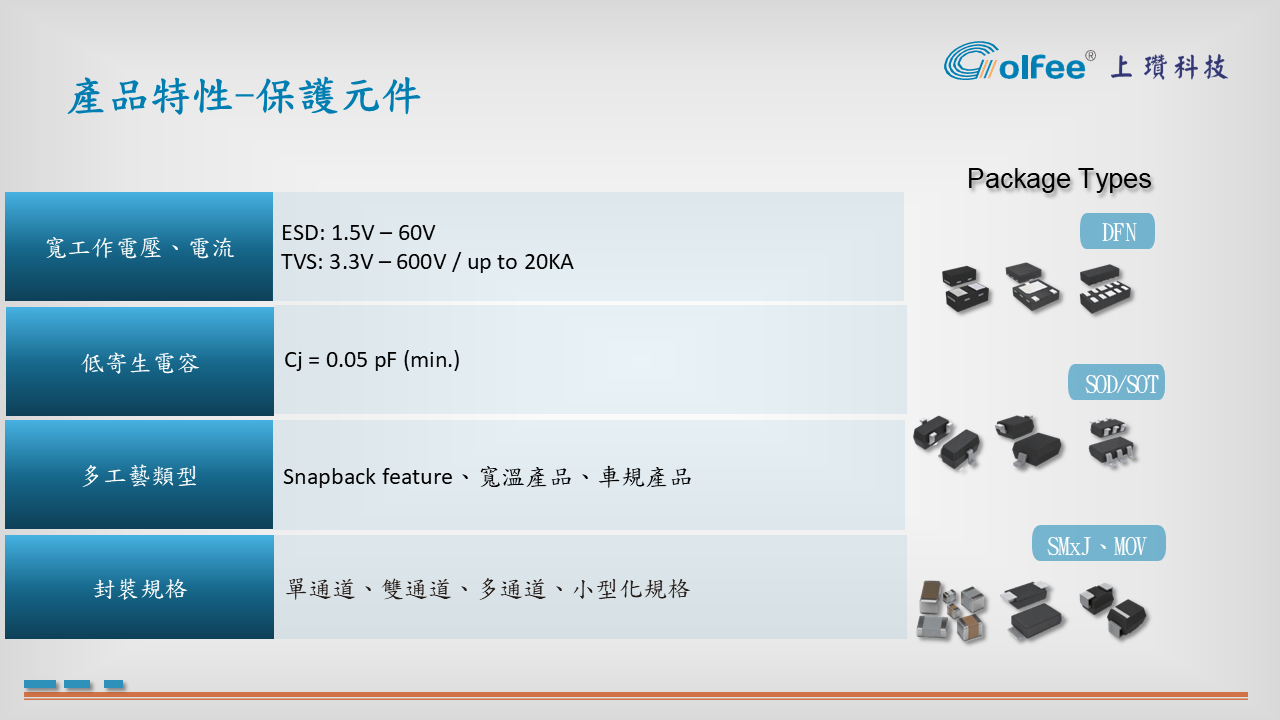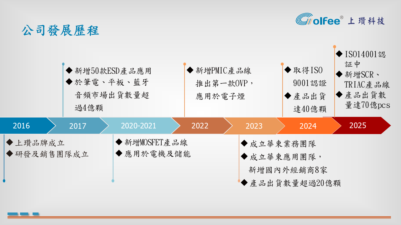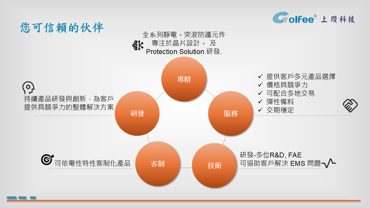 上瓚科技成立於2016年,專注於電路保護產品(TVS/ESD/GDT)及高性能功率半導體(MOSFET)的研發。核心研發團隊來自 Motorola、TI、Semtech 等國際大廠,具備豐富的經驗。已成功開發超過300款產品,並有90% 以上進入量產,深獲知名企業集團肯定。