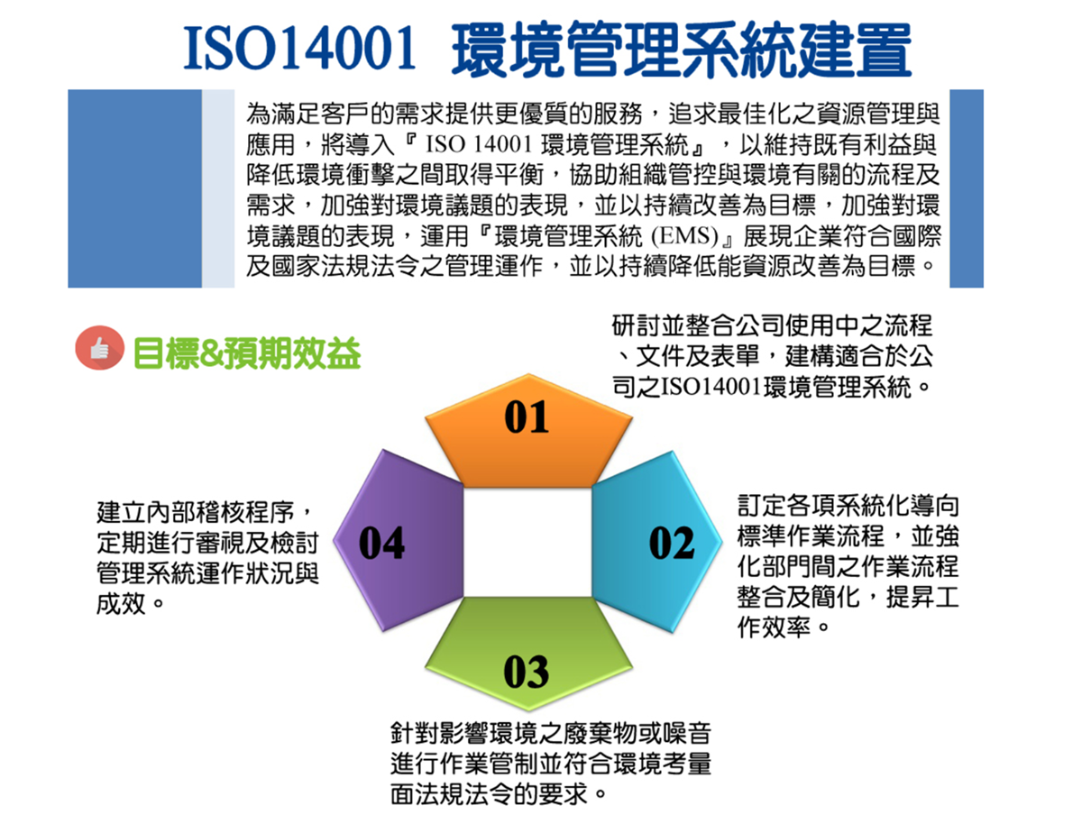 為確保符合國際標準,本公司已啟動 ISO 14001 環境管理系統認證計畫。 預計自 2025 年 11 月至 2026 年 5 月期間,將委託 承泓管理顧問有限公司 執行 ISO 14001:2015 年版系統的輔導作業。 目標在 2026 年完成由 SGS 執行的外部稽核,並正式取得認證資格。